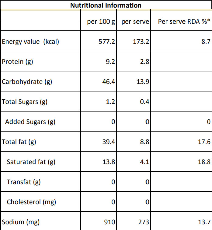 Besan flour, Rice Flour, Premium Refined Vegetable Oil, Peanuts, Cashew nuts, Garlic, Turmeric powder, Chilli powder, Spices and condiments and Iodised Salt.